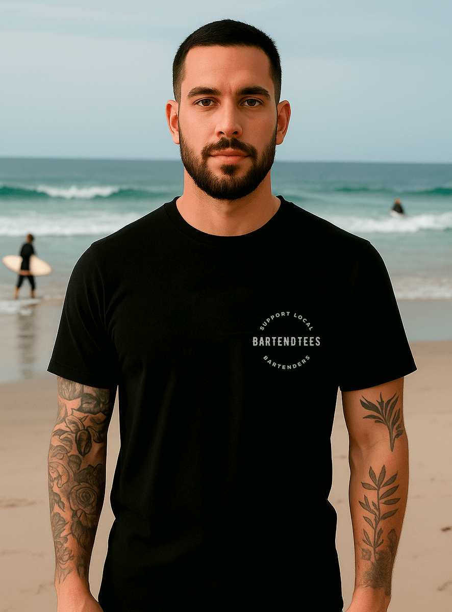 - Front: BartendTees pride, placed like a seal of approval from the service underground.