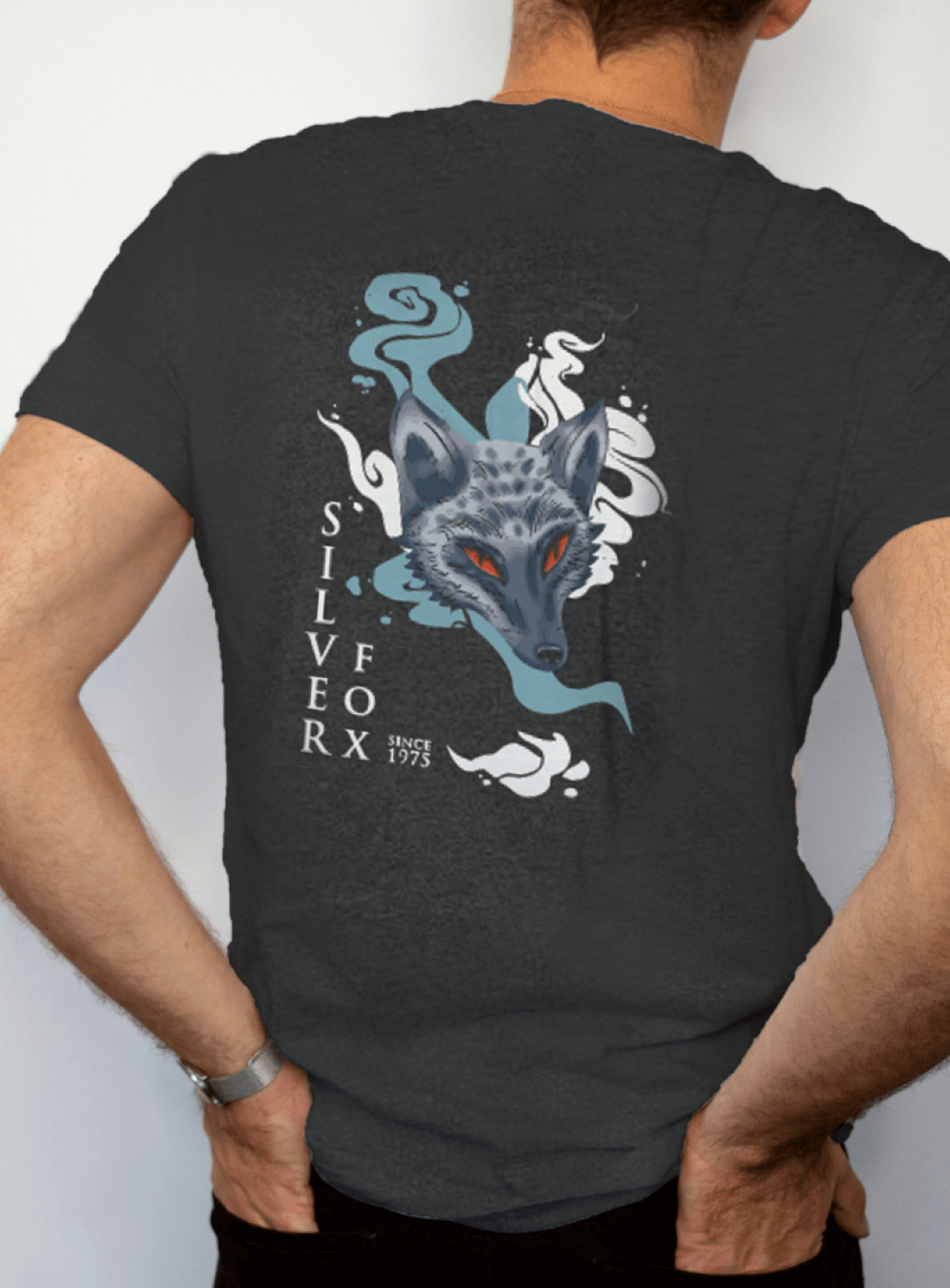 Unleash your inner mystery with the Silver Fox “Mystic Smoke” Graphic T-Shirt! This sleek dark gray tee features a minimalist “BartendTees” logo on the front and a stunning, detailed graphic of a silver fox surrounded by swirling mystic smoke on the back. The bold “Silver Fox” text and “Since 1975” tagline complete the look, adding a touch of timeless elegance.