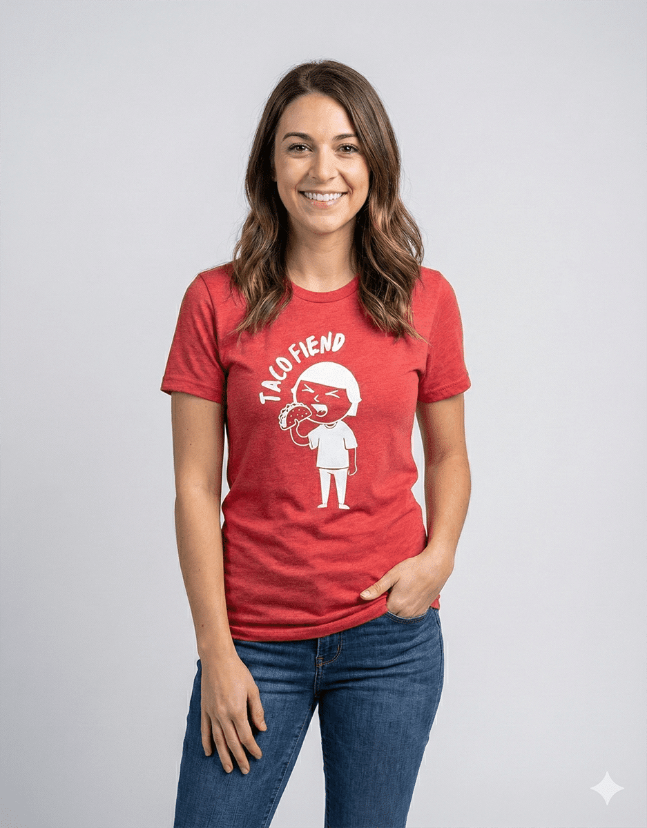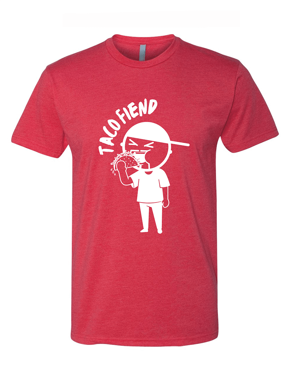 Featuring a bold white graphic on a vibrant red tee, this design pops from across the bar. The playful character and curved “TacoFiend” text bring personality, humor, and serious post-shift energy.